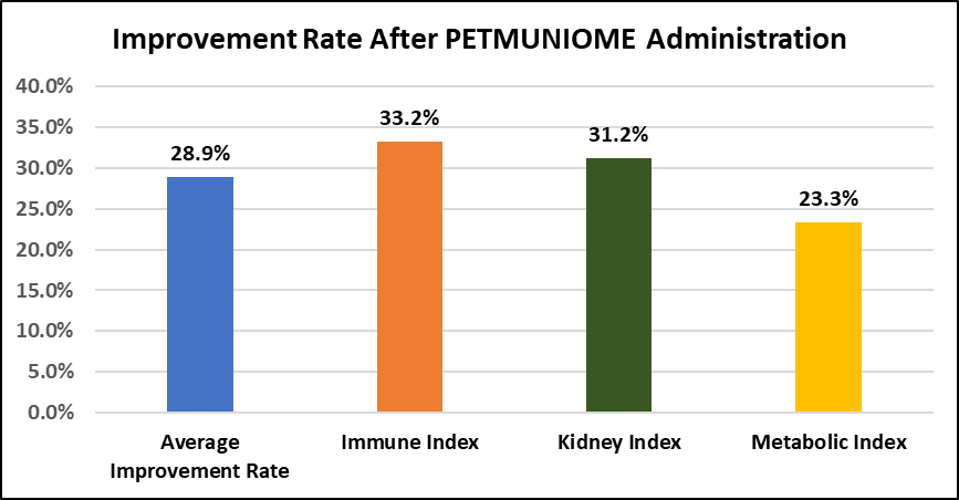 PETMUNIOME is an immune-strengthening product that demonstrated an average 28.9% improvement across 11 key biomarkers in a 3-month clinical trial involving 4 dogs with terminal cancer.