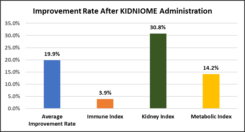 KIDNIOME is a kidney function recovery support product that demonstrated an average 19.9% improvement across 11 key biomarkers in a 3-month clinical trial involving 4 cats with end-stage kidney failure.